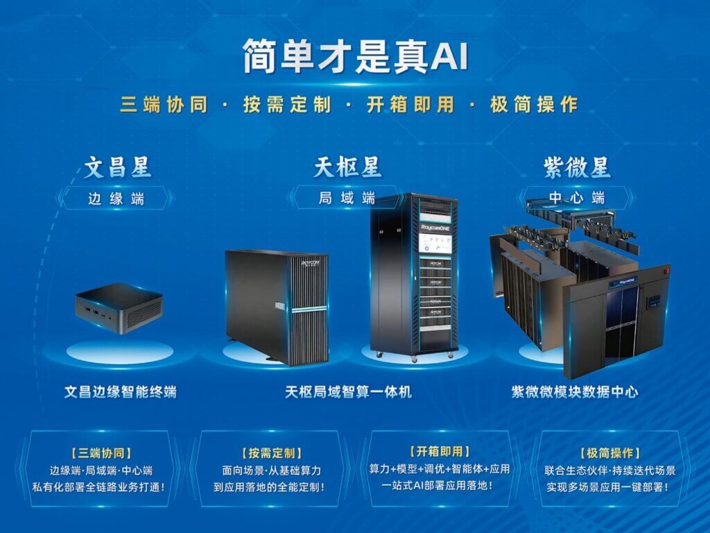 作为公司深耕AI应用落地的核心引擎,RoycomONE智算一体机已全面投入产业实践。该方案以”文昌星·天枢星·紫微星”三端协同为核心架构,覆盖从边缘端到局域端再到中心端的全链路私有化部署需求。